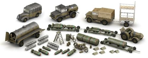 Обратите внимание на набор Hauler BRL72091 с гравировкой (доступен отдельно для этого набора) В набор входят: бомбы разного размера: 1000 фунтов, 500 фунтов, 4000 фунтов и 8000 фунтов; подробные модели зажигательных бомб; подробные модели тележек и тягачей; варианты для грузовиков Bedford MWD и MWC; подробные модели ремонтных вышек; различные аксессуары, такие как противооткатные упоры, велосипеды и лестницы; стандартная модель Tilly. Модель Avro Lancaster B.II, изображённая на коробке, в набор не входит, но её можно приобрести отдельно как AX08001 [Avro Lancaster B.I/III].