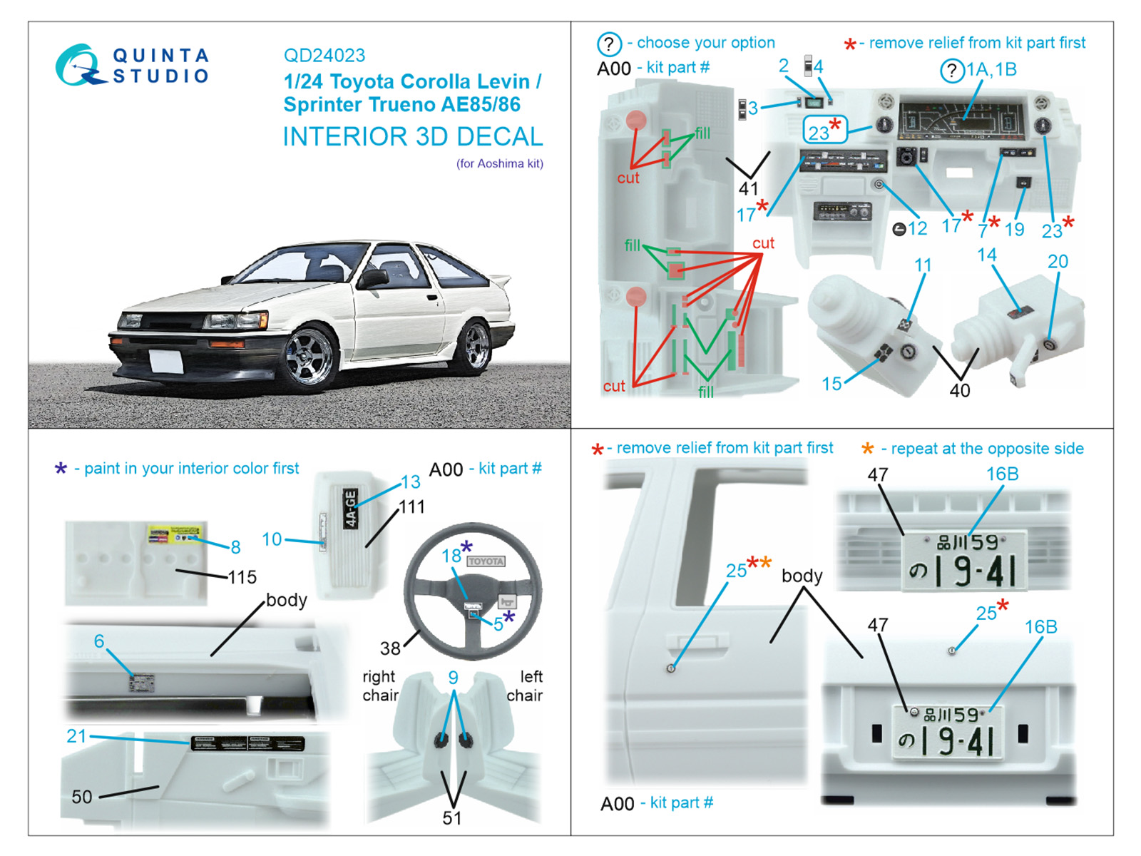 Toyota Corolla Levin AE85/86 3D-Printed & coloured Interior on decal paper (Aoshima)